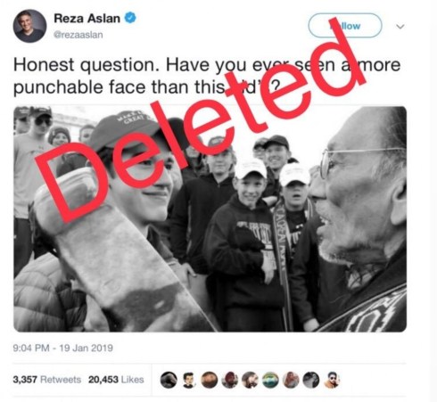 Add to this list, former CNN host, Reza Aslan’s now deleted post from January 20th 2019, which read: “Honest question. Have you ever seen a more punchable face than this kid’s?”
