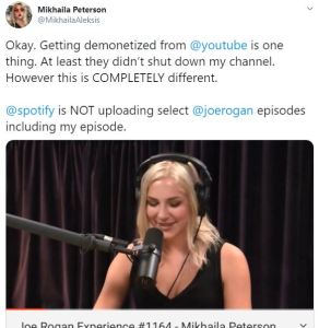 Mikhailia Peterson voiced her own concerns about potential censorship, in a Twitter thread that challenged Spotify to explain why it hadn’t released the full catalogue, when that was what had been advertised.