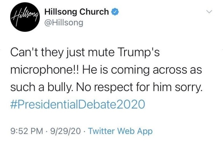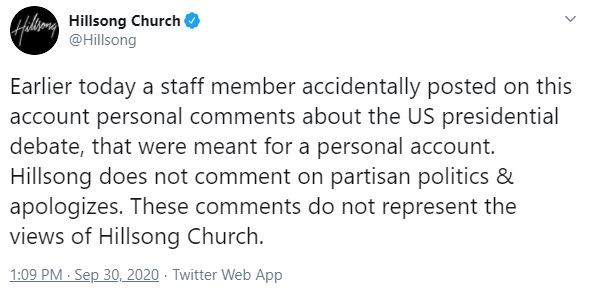 The “gaffe” was quickly deleted, with Hillsong posting an apology soon after, saying, “Earlier today a staff member accidentally posted on this account personal comments about the US presidential debate, that were meant for a personal account. Hillsong does not comment on partisan politics & apologizes. These comments do not represent the views of Hillsong Church.”